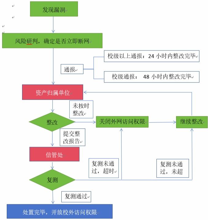 4. 信息化建设管理处规划与安全中心对网站(信息系统)进行漏洞复测,确认整改完成后,根据需要上报上级主管部门,并开放外网连接;否则继续整改,直至整改完成。